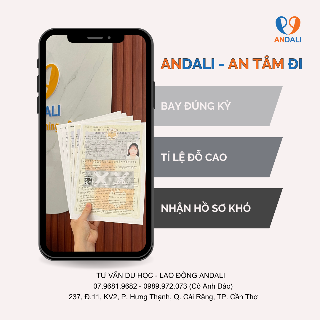 ANDALI – thương hiệu của Công ty TNHH Dali’s, là đơn vị tư vấn du học và lao động uy tín tại Cần Thơ, đồng hành cùng người trẻ trên hành trình vươn mình ra quốc tế. Chúng tôi không chỉ giúp bạn tìm cơ hội học tập và làm việc tại Nhật Bản, Hàn Quốc, Đài Loan, mà còn giúp bạn hiểu mình – chọn đúng – hành động đúng để tự chủ tương lai và tự do tài chính.