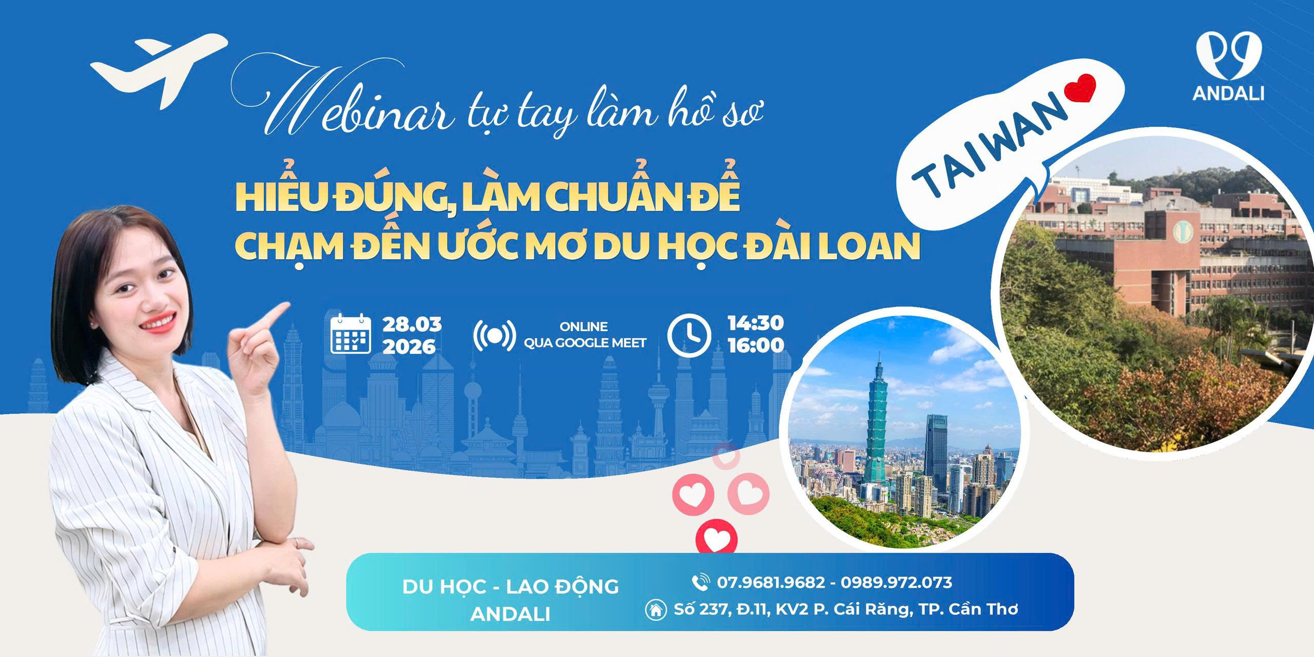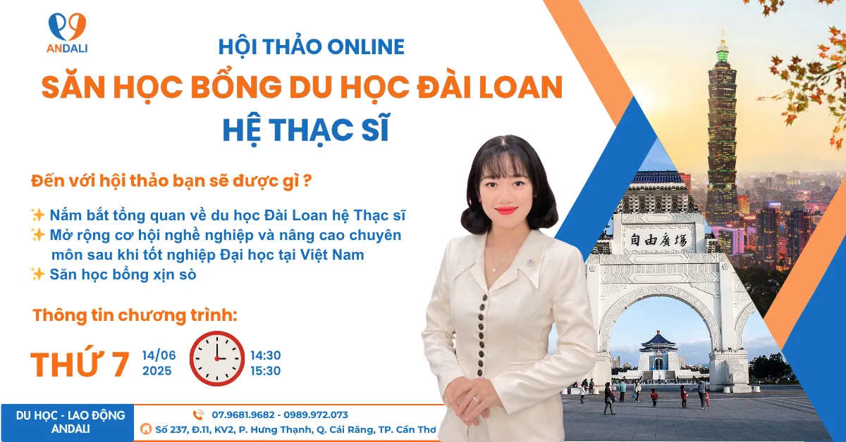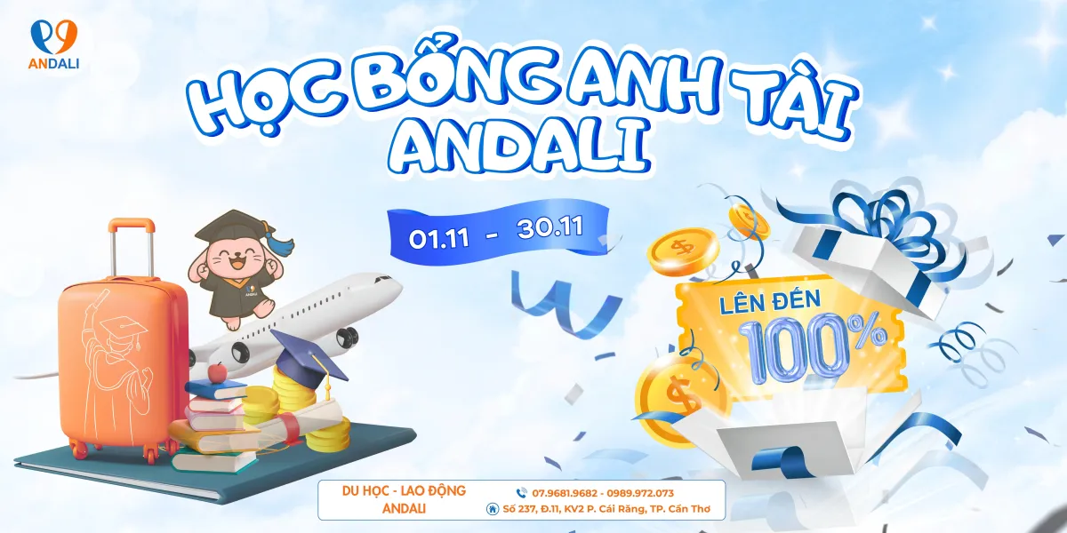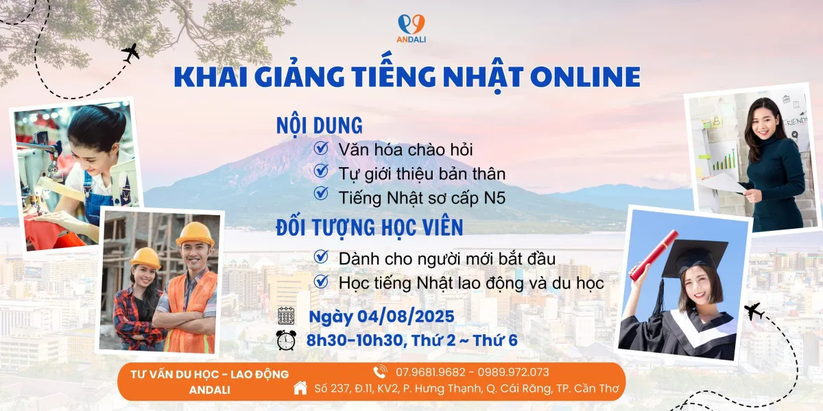 ANDALI – thương hiệu của Công ty TNHH Dali’s, là đơn vị tư vấn du học và lao động uy tín tại Cần Thơ, đồng hành cùng người trẻ trên hành trình vươn mình ra quốc tế. Chúng tôi không chỉ giúp bạn tìm cơ hội học tập và làm việc tại Nhật Bản, Hàn Quốc, Đài Loan, mà còn giúp bạn hiểu mình – chọn đúng – hành động đúng để tự chủ tương lai và tự do tài chính.