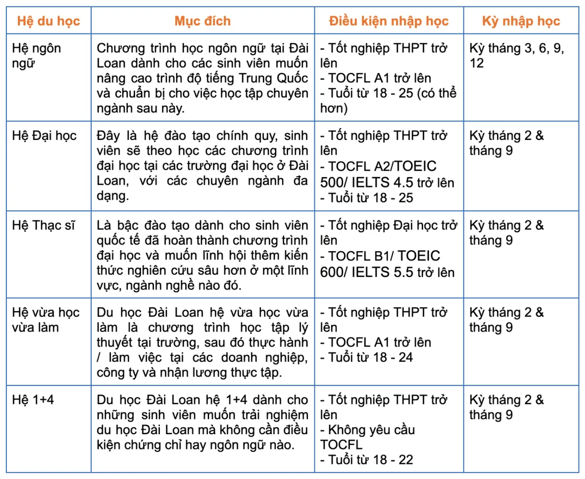 Đài Loan nổi bật với một hệ thống giáo dục đa dạng và chất lượng cao, cung cấp các chương trình đào tạo ở nhiều cấp độ khác nhau, từ bậc đại học, thạc sĩ đến tiến sĩ. Với mỗi hệ đào tạo khác nhau sẽ có những yêu cầu về điều kiện khác nhau.