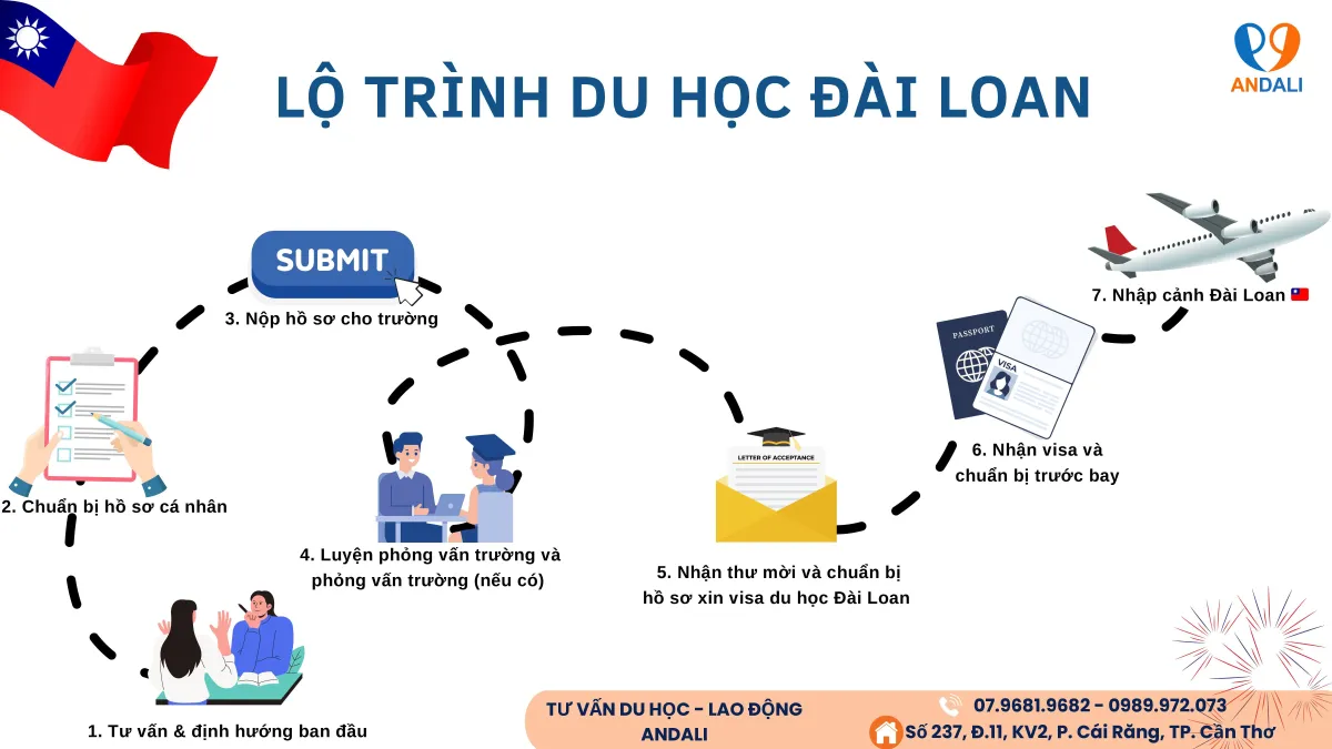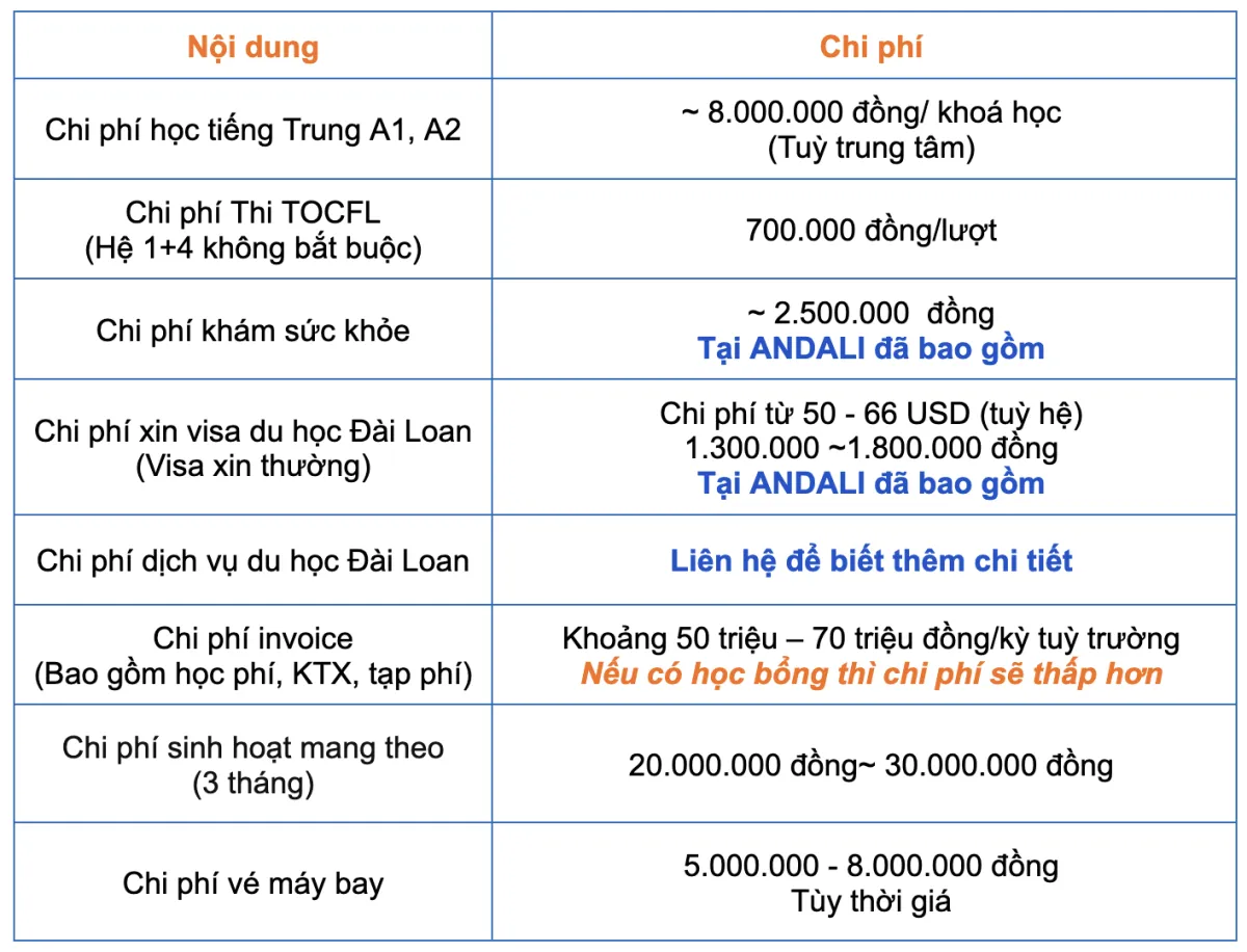 Bên trên lộ trình du học tại ANDALI và các thông tin cần biết để chuẩn bị du học Đài Loan. Nếu còn các thông tin nào chưa rõ, đừng ngần ngại hãy nhắn ngay cho ANDALI để được giải đáp thêm các thông tin nhé!